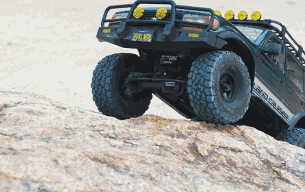 The FCX10 OVR LC80 RC crawler moves slowly and steadily over rocks, with tire tread finding grip on uneven surfaces.