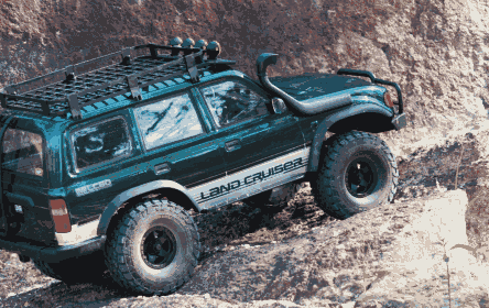 Watch one wheel of the LC80 climb an obstacle while the threaded metal shock compresses and extends—a satisfying display of suspension travel.