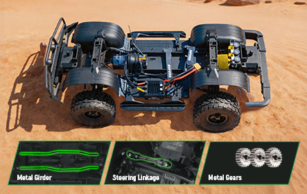 Under the LC80 off-road RC cars sits a chassis with metal rails, metal links, and all-metal gears—built to take a beating.