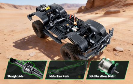 3541 outrunner brushless motor (1200KV) paired with a 50A ESC hits 20km/h; high/low gears let you crawl or bash as you like.